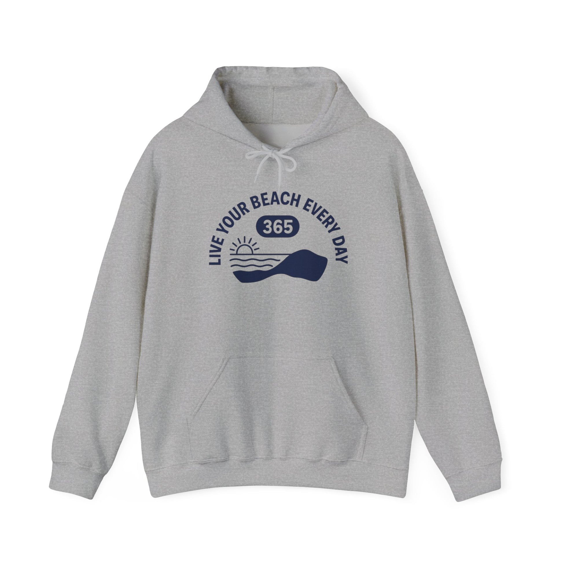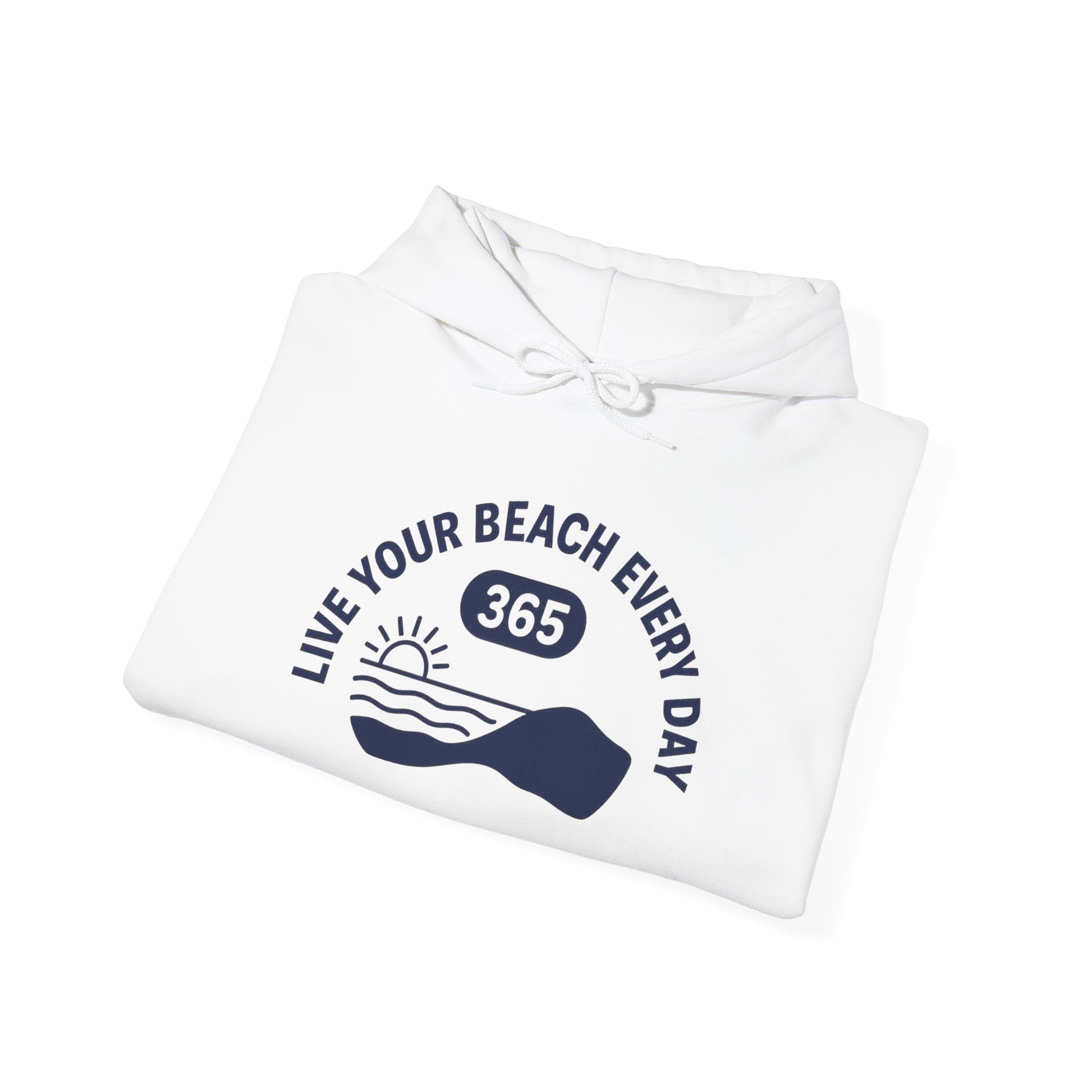Wrap yourself in a quiet promise: a soft, midweight hoodie that carries a simple seaside scene and the line “Live Your Beach Every Day — 365.” The clean navy artwork on a calm white ground feels like a little escape you can pull on whenever you need it. Wear it after an early surf, on foggy morning walks, or while you brew coffee and plan your next weekend. The roomy kangaroo pocket keeps hands warm. The double-lined hood and color-matched drawcord add subtle polish. It’s sturdy enough for daily wear, breathable enough for layering, and made with responsibly sourced cotton for a more thoughtful closet choice.